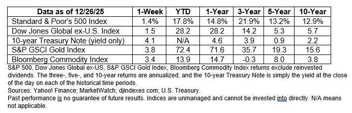 While geopolitics and policy uncertainty gave everyone a lot to think about, the performance of companies in the Standard & Poor’s (S&P) 500 Index sustained investors’ confidence and helped drive markets higher over the year. For example, John Butters of FactSet reports on earnings (what’s left after a company subtracts its expenses from its income) for S&P 500 companies. Here’s what he reported during 2025: