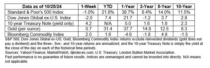 Last week, the S&P 500 Index and Dow Jones Industrial Average moved lower, while the Nasdaq notched a seventh week of gains. Yields on longer maturities of U.S. Treasuries moved higher over the week.
