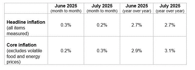 Headline inflation moved slightly lower, on a month-to-month basis (from June to July). It remained steady year over year, which is the 12-month period through July 2025. In contrast, core inflation, which excludes volatile food and energy prices, moved slightly higher on a month-to-month basis (from June to July). It increased year over year.