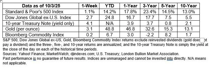 The fourth quarter began with a government shutdown. The closure had little effect on market optimism, and major U.S. stock indexes moved higher last week. Yields on U.S. Treasuries generally dipped lower or remained steady over the week.