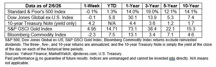 Last week, “Treasuries surged, driving yields down the most in months, as signs of weakness in the U.S. job market helped deepen the retreat from stocks, commodities and cryptocurrencies and boost wagers on Federal Reserve policy easing,” reported Elizabeth Stanton and Miles J. Herszenhorn of Bloomberg. The Standard & Poor’s 500 and Nasdaq Composite Indexes moved lower, while the blue-chip Dow Jones Industrial Average surpassed 50,000 for the first time.
