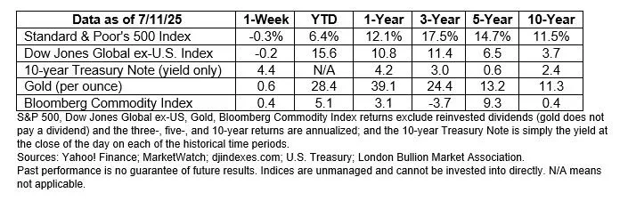 “Record highs and down weeks don’t typically go together, but the declines themselves are relatively minuscule, especially given the tariff headlines generated during the week—the possibility of 50 [percent] levies on Brazil and 35 [percent] on Canada, among others, if negotiations don’t go well—and continued attacks on Federal Reserve Chair Jerome Powell. The S&P 500, after all, is still up 26 [percent] from its April low and has gained 6.4 [percent] this year,” reported Jacob Sonenshine of Barron’s.